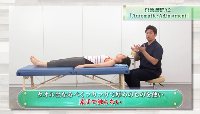 篠崎先生の施術法は1分から3分軽く触れるような調整で全身のバランス、全身の筋肉の硬さが一気に変化します。